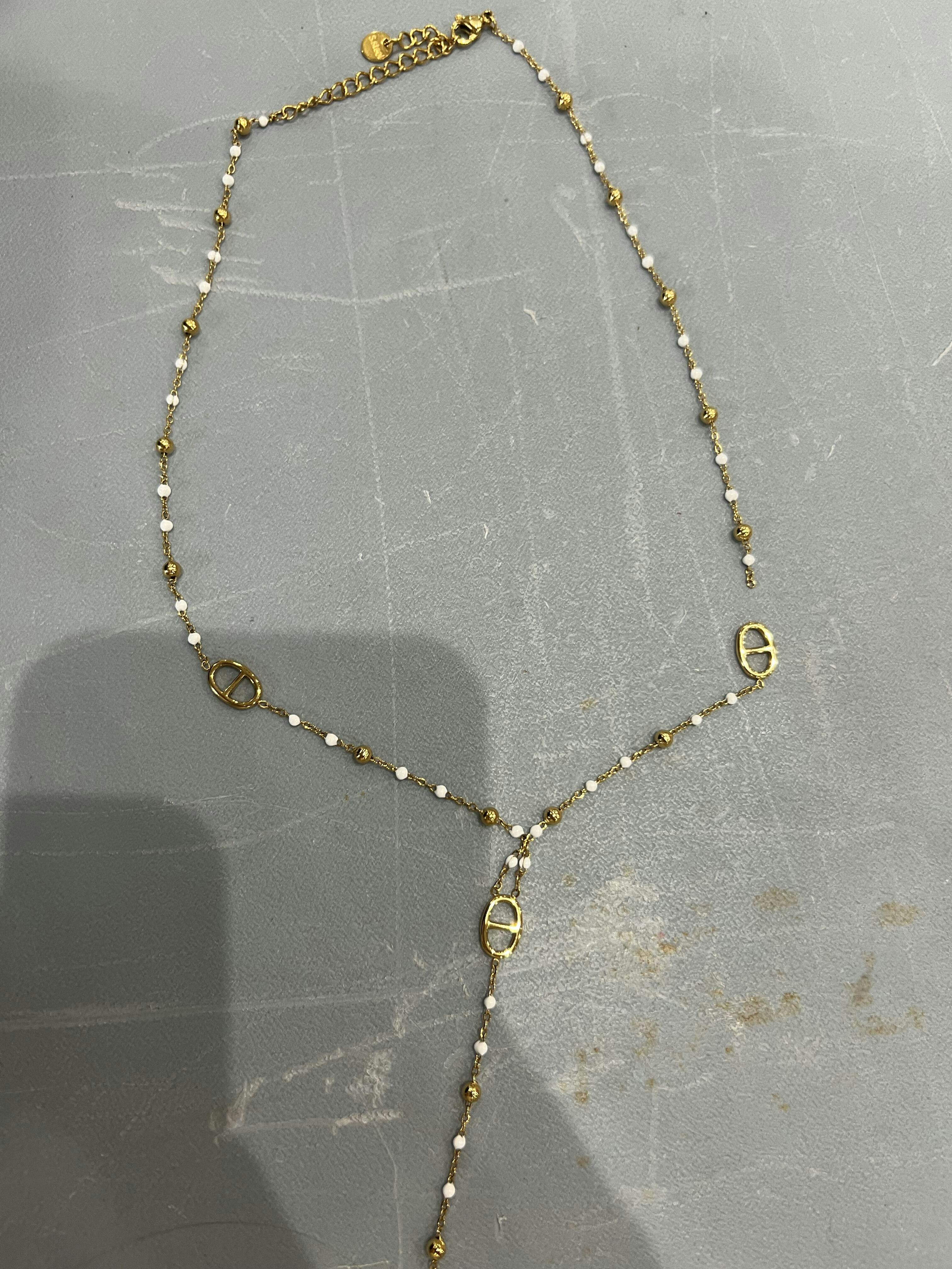 Découvre notre collier Elodie en Y avec ses noeuds marins et ses perles blanches